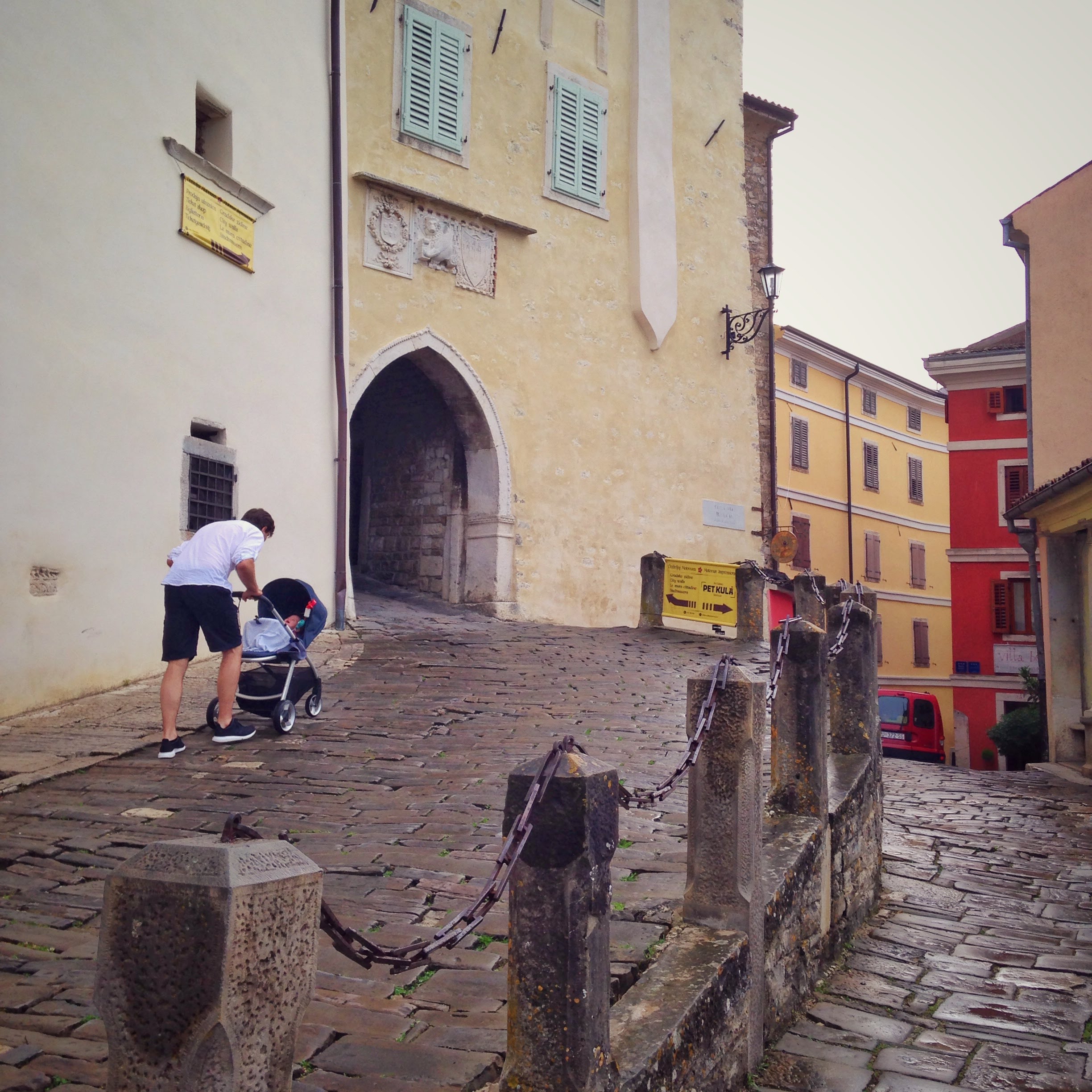 Zarówno Hum, Motovun, jak i Groznjan zrobiły na nas bardzo dobre wrażenie, małe, zadbane miasteczka, położone niedaleko siebie, idealne do zwiedzenia w jeden dzień. Raczej jednak nie dla spacerów z wózkiem, bo mają kamieniste, bardzo nierówne uliczki. Hum jest maleńki – w końcu szczyci się, że jest najmniejszym miastem świata – więc nie było problemu z wzięciem malca na ręce. W Motovun namęczyliśmy się natomiast z wózkiem. Groznjan maluch przespał w foteliku, zmęczony całodziennym zwiedzaniem. Do żadnego z tych miasteczek nie można wjechać autem, dlatego też przygotowano parkingi, w Hum płatny kilka euro, w Groznjan bezpłatny, a w Motovun w zależności czy wjeżdżasz pod samo miasteczko (wtedy płatny), czy też zostawiasz auto na dole i podjeżdżasz autobusem (wtedy bezpłatnie), my wybraliśmy opcję z wjechaniem i to był dobry pomysł, bo pogoda nie była idealna, trochę padało, więc bliskość auta była dużym plusem.